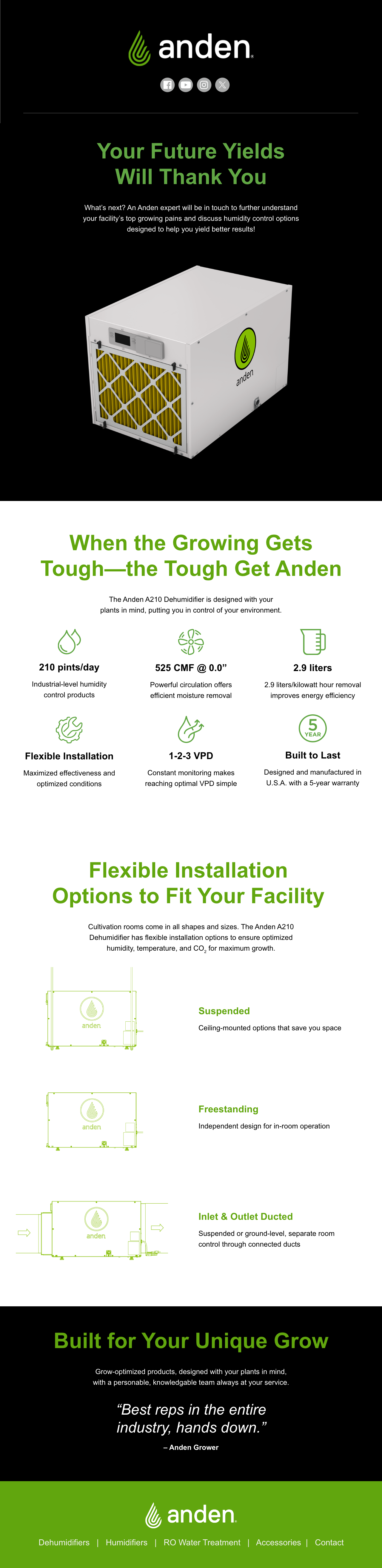 Anden specializes in professional-grade humidity control systems built specifically for indoor cannabis cultivation. Their grow-optimized dehumidifiers, humidifiers, and precision controls handle challenging environments designed to maximize yield by producing healthier crops.